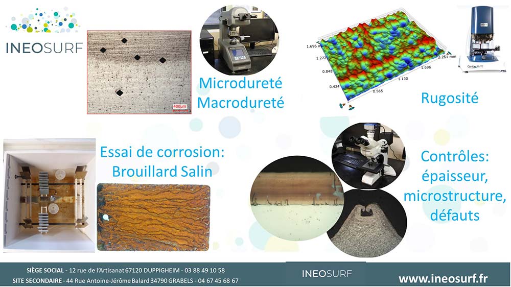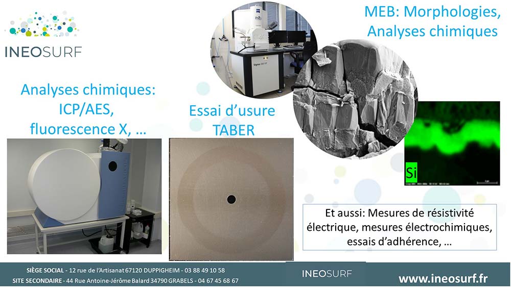 Un large panel d’équipements dédiés à la caractérisation microstructurale, mécanique et physico-chimique des matériaux métalliques et des revêtements et à l’analyse de défaillances (usure, corrosion, rupture) : MEB FEG avec analyseur EDX, Spectromètre à Emission Optique ICP-OES, Analyseur carbone soufre, Fluorescence X, Spectrométrie à Décharge Luminescente SDL, enceintes climatiques pour évaluation de corrosion accélérée, Mesures Electrochimiques, Diffraction des rayons X (DRX), Microscope interférentiel, Essais mécaniques (dureté , traction, usure, adhérence), polisseur ionique.